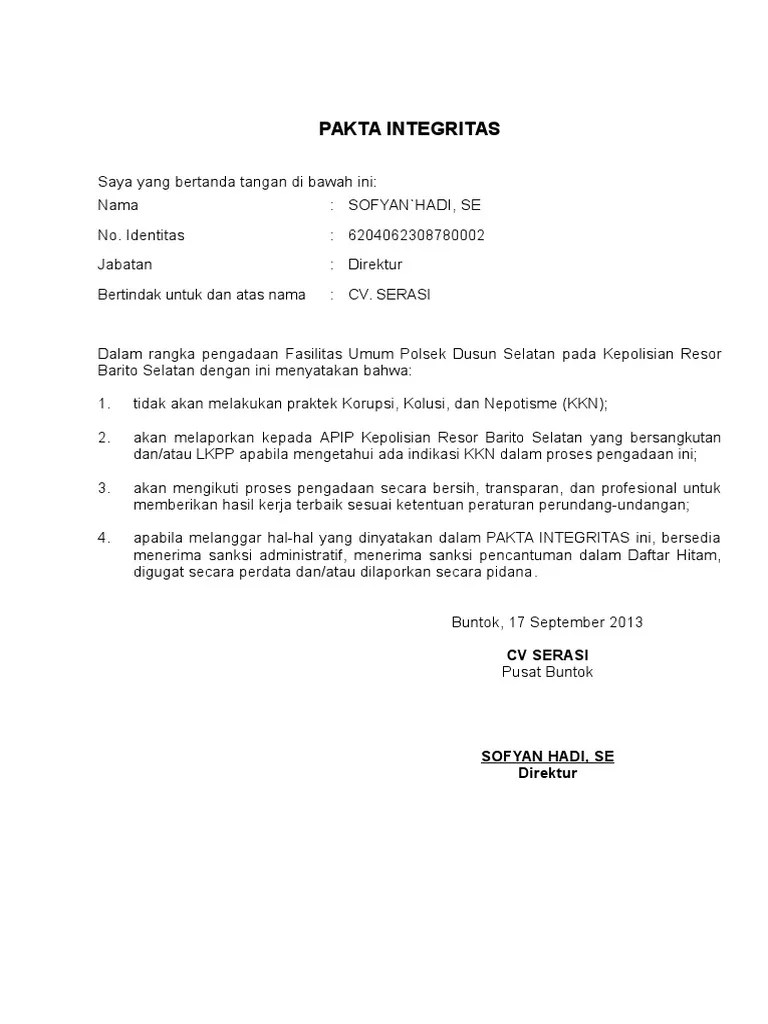 2011 tentang pedoman umum pakta integritas di lingkungan k/l dan pemda. Pakta integritas guru ini intinya sebagai pernyataan kesanggupan untuk menjalankan tugas pokok dan fungsi sebagai guru. Kamis, 10 januari 2019 bapak ketua pengadilan agama karangasem, memimpin kegiatan penandatanganan surat pernyataan / pakta integritas pegawai honorer. Apr 22, 2017 · pakta integritas merupakan sebuah bentuk dokumen yang berisi tentang pernyataan perjanjian secara bersama atau dapat disebut sebagai komitmen dalam bentuk kesanggupan, patuh terhadap ketentuan yang berlaku.dalam hal ini, list kerja hanya menerangkan sedikit penjelasan dan juga beserta contoh pakta integritas sebagai acuan untuk anda saat diperlukan. Memerintahkan seluruh pegawai yang ada dibawah pengawasan saya untuk.